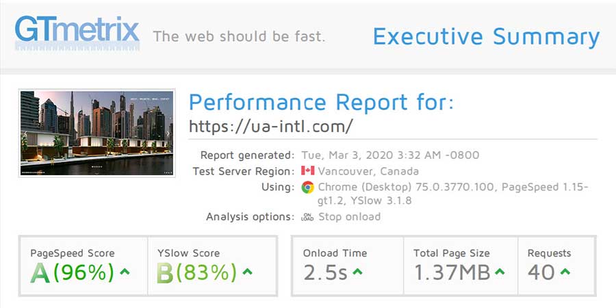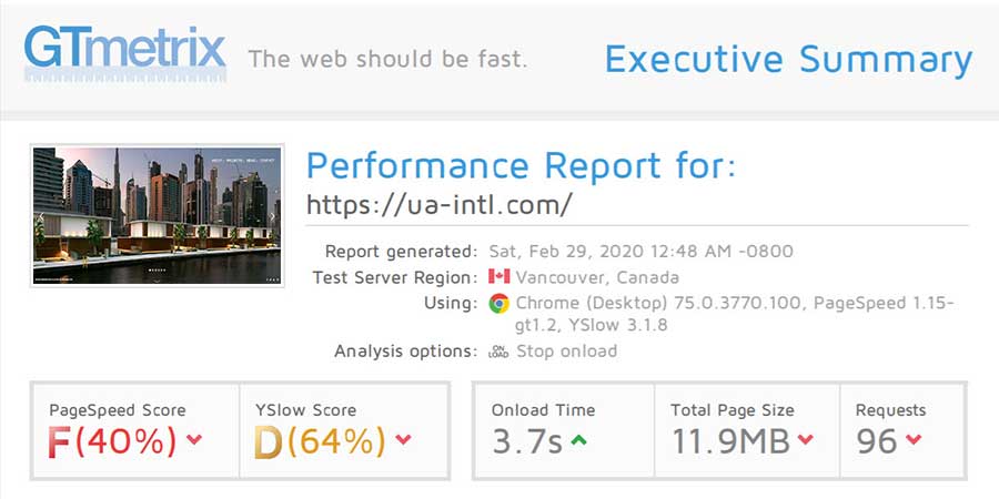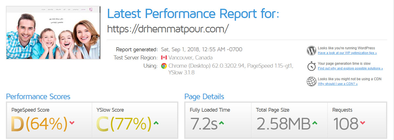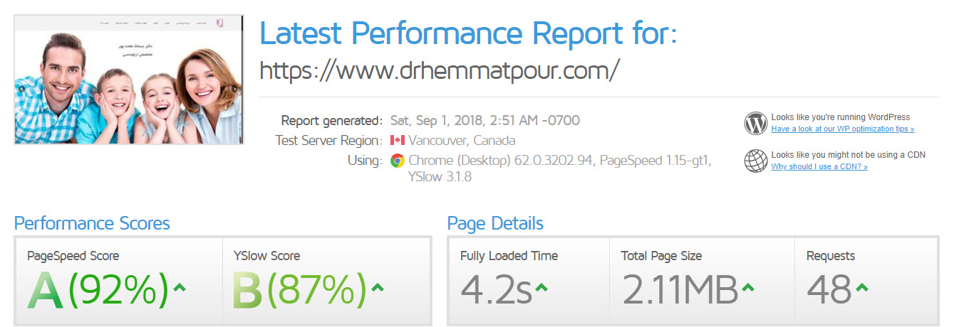 در این وب سایت سرعت لود صفحات بسیار بالاست و مشکلات زیادی در تصاویر ، تعداد درخواست ها و همچنین زمان بارگذاری صفحه وجود داشت، به دلیل استفاده از تصاویر بهینه نشده و همچنین استفاده از پلاگین های غیر ضرور سرعت بسیار پایین است . تعداد درخواست ها در این وب سایت 96 درخواست بوده و حجم صفحه اصلی وب سایت 11.9 مگابایت بوده که فاصله ی بسیار زیادی با استاندارد های گوگل دارد . در ادامه ملاحظه میفرمایید که پس از بهینه سازی سرعت چه اتفاقی برای این وب سایت افتاده است .