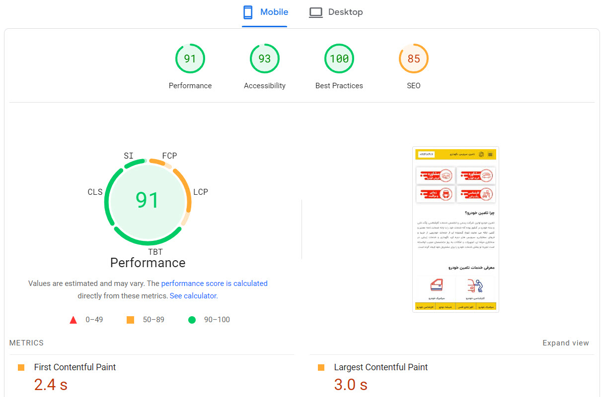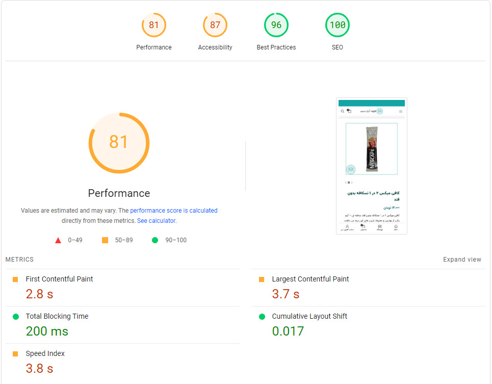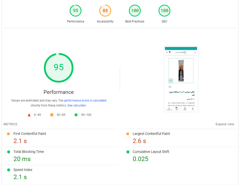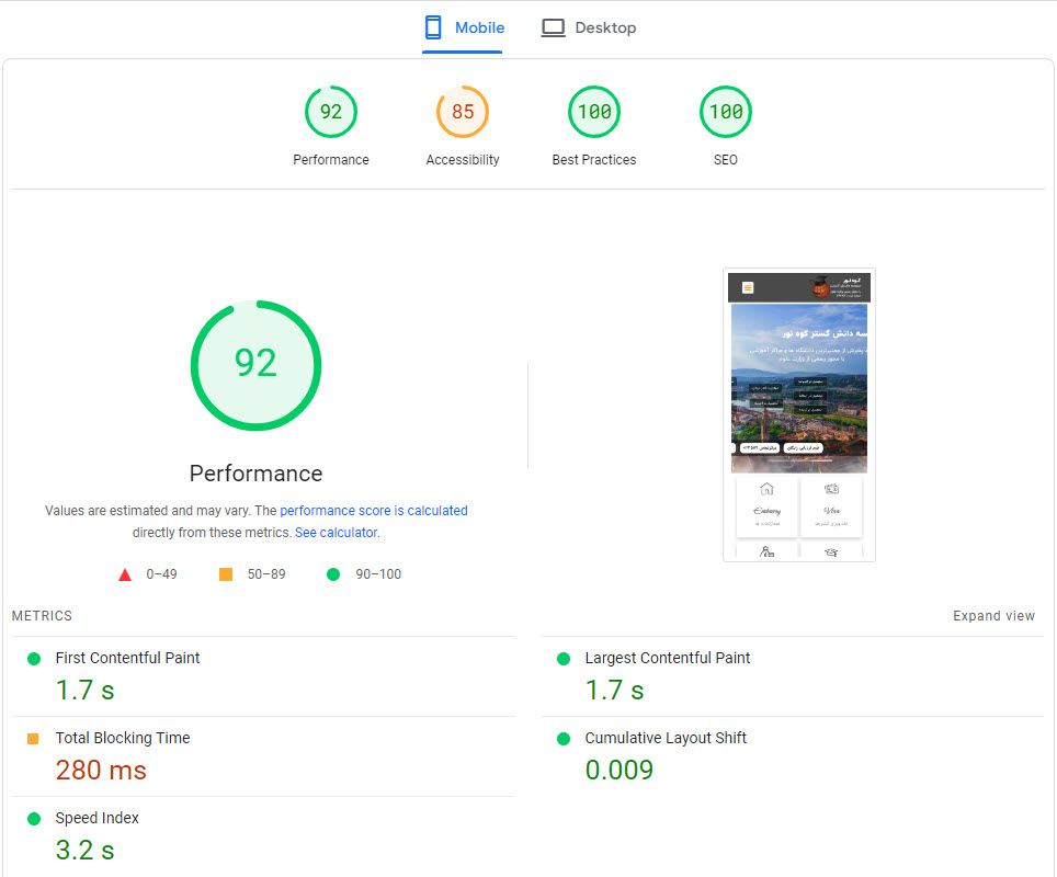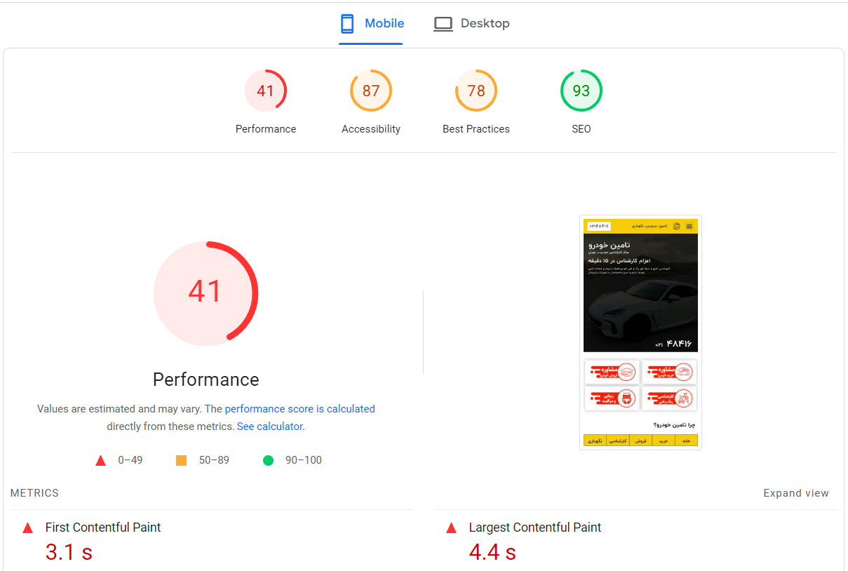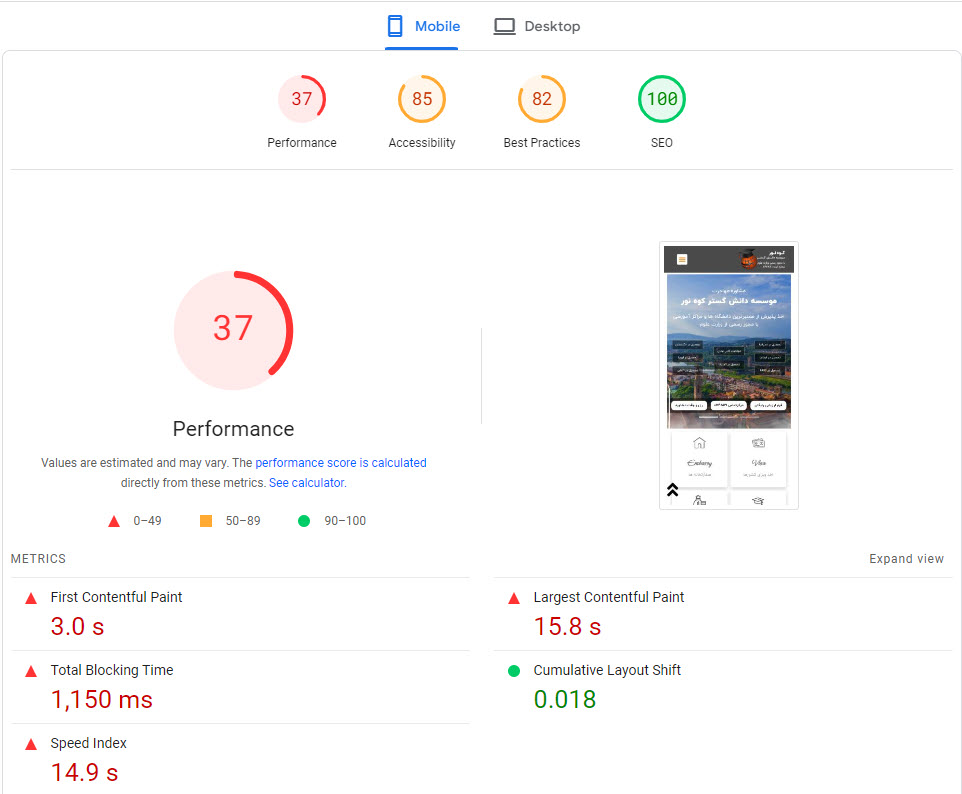 در این نمونه که خود سایت اصلی آرتیمان را بررسی میکنیم مشاهده میکنید که زمان لود کامل سایت به 33.5 ثانیه رسیده است و همچنین حجم صفحه اصلی سایت برابر با 1.45 مگابایت است و 108 درخواست برای لود سایت ارسال میگردد ، کاری که باید انجام شود این است که این موارد بررسی و رفع شود ، برای سایت های کوچک با حجم محتوای پایین شاید خیلی نتوان به 100% رسید چون برای بالا بردن سرعت لود سایت کمی هزینه نیز لازم است مثل فعال کردن CDN و همچنین داشتن سرور اختصاصی قدرتمند ولی میتوان آن را در رتبه ای بین 90 الی 98 نگه داشت .